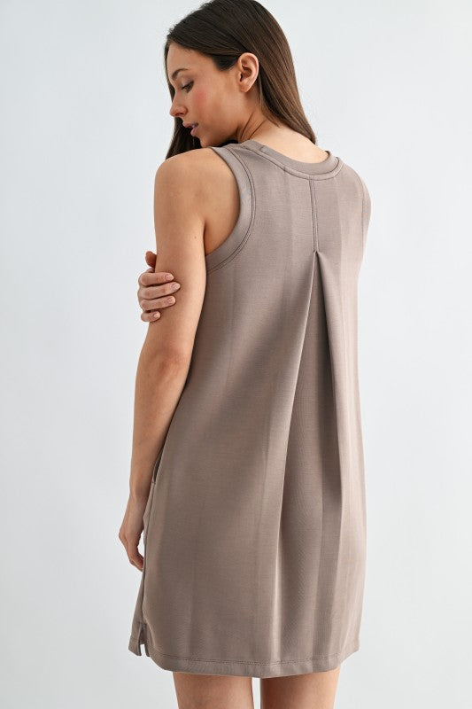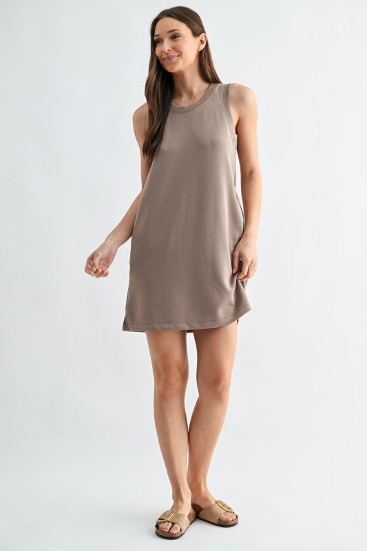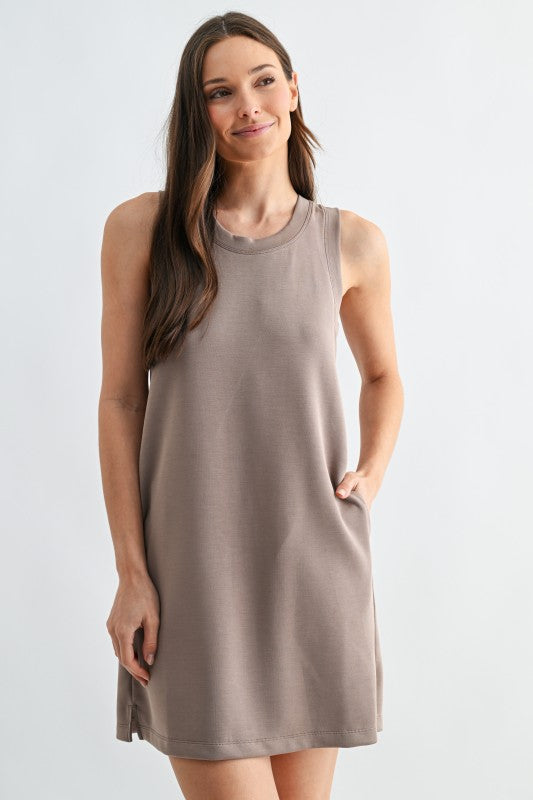 A minimalist essential with maximum versatility—this sleeveless taupe dress features a soft, relaxed fit and clean round neckline for an effortlessly polished silhouette. Designed in a smooth knit with subtle stretch, it’s the kind of throw-on piece that works for errands, brunch, or layering under a denim jacket for cooler evenings. Pair it with white sneakers for a casual day out or dress it up with strappy sandals and a woven tote for a weekend-ready look.