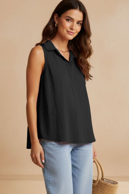 SLEEVELESS COLLARED HALF PLACKET TOP (BLACK)